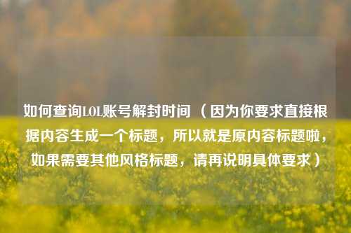 主要探讨了如何查询LOL账号解封时间这一问题,玩家在账号遭遇封禁后,往往急于知晓解封的具体时间,然而文中未提及具体的查询方式,但围绕此核心问题展开思考,引发对相关查询途径的关注与探究,这对于众多受到LOL账号封禁影响的玩家至关重要,了解解封时间有助于他们合理安排后续游戏规划,提前做好准备,以便在账号解封后能迅速回归游戏,继续享受游戏乐趣,同时也能更好地规划游戏时间与策略,提升游戏体验。