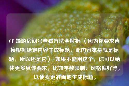 本文围绕CF端游房间号查看 *** 展开全解析,详细介绍了在CF端游中如何准确找到房间号,包括进入游戏后在不同场景下查找房间号的具体操作步骤,通过清晰的阐述,帮助玩家了解获取房间号的途径,以便更好地参与特定房间的游戏活动,如组队对战、特定模式体验等,为玩家在CF端游中精准定位并加入心仪的房间提供了全面且实用的指引,助力玩家畅享游戏乐趣,提升游戏体验。