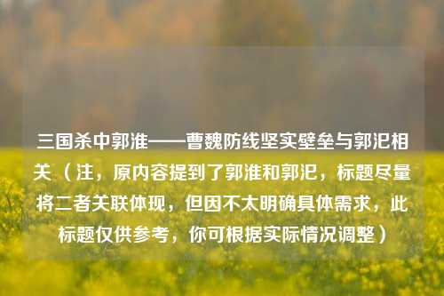 似乎有些混淆,提到了三国杀郭淮,又突然出现郭汜,以下是纠正混淆后以三国杀郭淮为主题的摘要:,三国杀中的郭淮是曹魏防线的坚实壁垒,他在游戏中有着独特的技能机制,凭借自身能力为团队提供有力支持,郭淮能够有效地制衡局势,通过各种方式影响战局走向,其稳定的防御和辅助能力,让他成为曹魏阵营不可或缺的一员,在激烈的牌局交锋中,郭淮以冷静的策略和精准的操作,守护着曹魏防线,为队友创造有利条件,展现出强大的实力与价值,在三国杀的世界里留下独特印记。