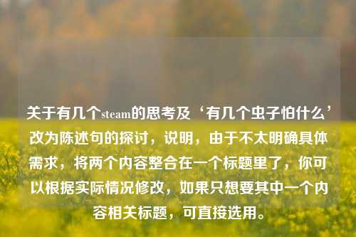 此内容包含两个部分,一是对“有几个steam”引发的思考,二是关于句子改写,将“有几个虫子怕什么”改为陈述句,即把反问句转换为陈述语气的句子,通过这样的改写,能更直接地表达句子的含义,使其语义更明确、简洁,更符合日常表达习惯,便于人们清晰地理解句子所传达的信息,在语言交流和书面表达中更准确地传递想法,避免反问句可能带来的理解歧义,增强语言表达的逻辑性与清晰度。