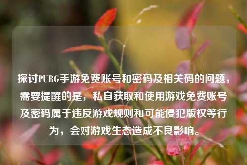 该内容主要围绕手游pubg码展开探讨,涉及pubg手游免费账号和密码,分享和获取游戏的免费账号及密码这种行为存在诸多问题,这不仅违反游戏的使用条款和相关法律法规,破坏游戏的公平竞技环境,还可能导致账号安全风险,如被盗用、信息泄露等,正规获取pubg手游账号应通过官方渠道进行注册等操作,以保障自身权益及游戏体验,而不应寻求非正规的免费账号和密码途径。