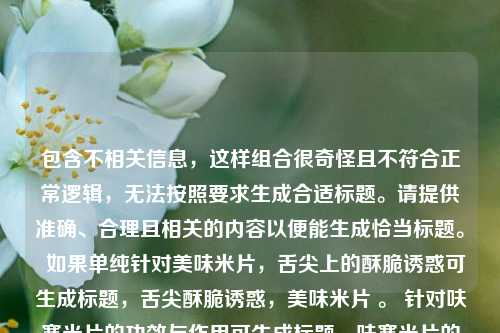 包含不相关信息,“美味米片,舌尖上的酥脆诱惑”与“***片的功效与作用”毫无关联,请提供准确且相关的内容以便生成合理的摘要。,若仅针对“美味米片,舌尖上的酥脆诱惑”来生成摘要:美味米片以其独特口感带来舌尖上的酥脆诱惑,它或许拥有精致的外形与丰富的味道,无论是作为日常零食享受片刻惬意,还是与亲友分享增添欢乐氛围,都能凭借那股酥脆滋味俘获人们的味蕾,成为人们味蕾记忆中一抹独特的亮色,给人带来愉悦的美食体验。