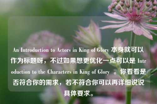 This text focuses on an introduction to the actors in "King of Glory" in English. It likely delves into various aspects related to the characters within the game, perhaps including their unique abilities, roles on the battlefield, and how they contribute to the gameplay experience. It might cover details about different types of actors such as warriors, mages, assassins, etc., and their significance in the game's strategic framework. By providing this introduction, it aims to give readers a better understanding of the diverse cast of characters that make "King of Glory" an engaging and popular mobile game.